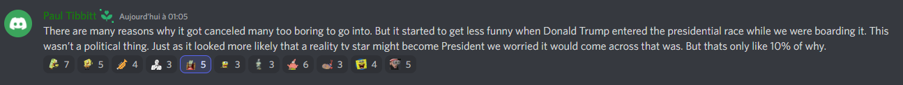 According to Paul Tibbitt, there were many reasons as to why this story got cancelled. One of them being related to Donald Trump joining the 2016 United States presidential election and how it looked likely that "a reality-tv star might become president."[32]