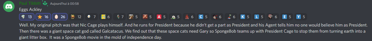 The "Alien Cat" storyline is the second pitch created by Paul Tibbitt [13][14] and Kyle McCulloch[15] and written by Jonathan Aibel and Glenn Berger. [16] Andrew Goodman later helped with the story in 2017.[17] Unlike the first pitch or the final version of the movie, this storyline is more "Science-fiction" inspired, and was described as a "SpongeBob movie in the mold of Independence Day."[18] This version started development around fall 2015 and was cancelled in July 2017.[19]